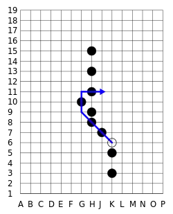 - Стрибок від K6 — G9 — J9 — G7 є незаконним, оскільки м'яч буде двічі стрибати через людину, яка знаходиться на H8, а вона повинна була видалена відразу після першого стрибка.