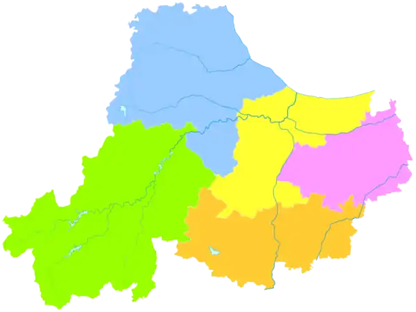 Міський округ поділяється на 2 райони й 3 повіти: