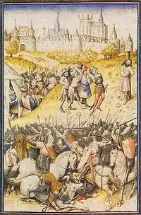 Вестготський герцог Теудігізел перекрив гірські проходи в Піренеях перед франкським військом, що поверталося на батьківщину з величезним обозом награбованого, і, попри чисельну меншість своїх воїнів, раптовим ударом відкинув франків. Проте надалі, усвідомлюючи, що йому не вдасться надовго затримати таку велику армію, він вступив у переговори з Хільдебертом і Хлотаром і за значну суму грошей відкрив прохід на період в один день і одну ніч. Франки, які не встигли відступити у відведений час, були безжально знищені готами.