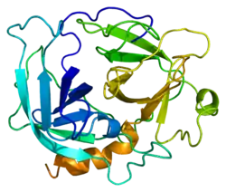 Кодований геном білок за функціями належить до гідролаз, протеаз, серинових протеаз. Задіяний у такому біологічному процесі, як альтернативний сплайсинг. Секретований назовні.