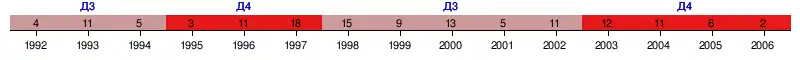 | 1989 | Друга ліга - 2 зона | 3 | 42 | 14 | 10 | 18 | 40 | 58 | -18 | 38 | 15. |