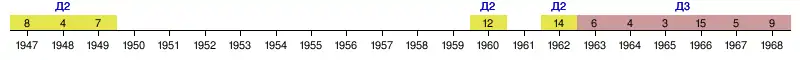 | 1947 | Друга група - РСФСР, 1 зона | 2 | 22 | 8 | 3 | 11 | 30 | 53 | -23 | 19 | 8. |