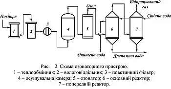 Атмосферне повітря проходить декілька етапів підготовки у теплообмінниках 1, вологовіддільниках 2, повстинних фільтрах 3 і осушувальних камерах 4, після чого надходить в озонатор 5. Отриманий озон послідовно подають в основний 6 і попередній 7 реактори. Стічні води надходять на озонування спочатку в попередній, а потім в основний реактори. Очищена вода видаляється з основного реактора, а відпрацьований газ — з попереднього.