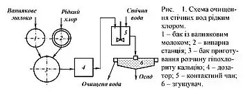 При окисненні ціанідів рідким хлором у лужному середовищі (рН = 10—11) рекомендується попередньо прохлорувати вапнякове молоко і додати отриманий розчин до стічної води, що очищується. Принципова схема очищення стічних вод цим методом наведена на рис. 1.