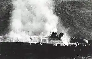 Літаки американської морської піхоти скинули на палубу «Хірю» 4 бомби. Потім авіаносець був обстріляний з кулеметів літаками B-17, які прилетіли з аеродромів Мідвею та Гаваїв. Загорілась носова частина корабля, проте «Хірю» зміг продовжити рух на захід. Згодом вогонь розповсюдився по кораблю та вийшов з-під контролю. Японські есмінці зняли з авіаносця членів команди, які ще залишились в живих, і після наказу затопити корабель по «Хірю» був здійснений пуск торпед. Проте авіаносець ніяк не тонув та залишався на плаву до ранку 5 червня. Він був сфотографований літаком з авіаносця «Хошо», який супроводжував лінкори адмірала Ямамото. Командир авіаносця контр-адмірал Ямагуті не захотів залишати корабель.
