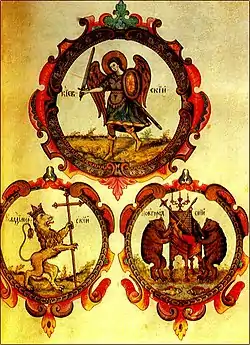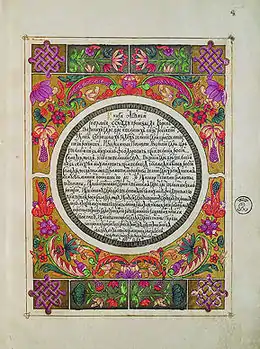 ![]() «Велика государєва книга або Корінь россійських государів», титульный лист из екземпляра Ермітажа з заголовком, вписаним в коло | |