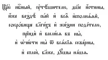 Царю́ небе́сний, Уті́шителю, Ду́ше і́стини, і́же везді́ си́й і вся́ ісполня́яй, сокро́вище благи́х і жи́зни Пода́телю, приіди́ і всели́ся в ни і очи́сти ни от вся́кія скве́рни, і спаси́, Бла́же, ду́ші на́ша.