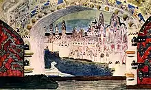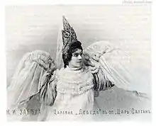 Прем'єра музичної драми, яка надихнула Врубеля, відбулася в Приватній опері С. І. Мамонтова 21 грудня 1900 року. Врубель створив ескізи для декорацій і костюмів. Партію Царівни-Лебеді виконувала його дружина Надія Забела-Врубель.