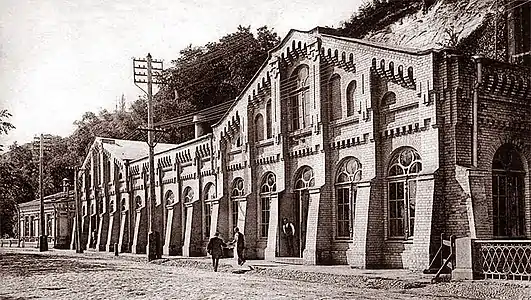У 1870-х роках з'явилися будинки без тиньку із чистим цегляним фасадом, першим з яких став готель «Національ» на Бессарабці, побудований архітектором Володимиром Ніколаєвим у 1870 році (не зберігся). Тоді ж звели залізничний вокзал, міський водогін 1870—1872 років, корпус № 10 (словолитня) Києво-Печерської лаври[10].
