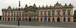 Нарядний фасад прикрашає безліч алегоричних фігур. На головному порталі — зображення прусського короля Фрідріха I, за наказом якого був побудований Цейхгауз. Дві богині Перемоги несуть його герб. Напис, сенс якого повинен підкреслити розумність застосування зброї тільки для справедливих цілей, зокрема свідчить: «…На страх ворогам, в ім'я охорони свого народу і союзників — Фрідріх I». Чотири жіночі фігури головного входу символізують піротехніку, арифметику, геометрію і механіку.