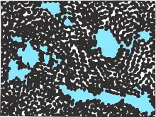 Спрощена модель структури цементного каменю. Великі чорні точки — гелеві частки, проміжки між ними — гелеві пори (величина яких перебільшена для наочності), простір пофарбований в блакитний колір — капілярні порожнини.