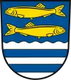 «Розділені по секції вала синій і срібний, зверху накладається два золотих шпроти, з яких верхня повернена на ліво-нижня на право, знизу дві сині смужки-близнюки».