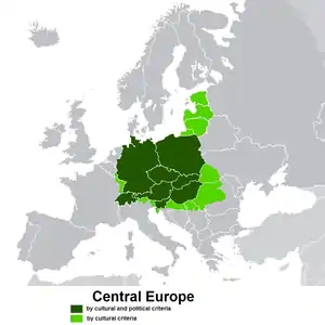 Центральна Європа. Зелений — за політичним та культурним критерієм, світло-зелений — за культурним критерієм