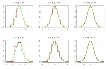 У перших версіях цієї теореми, нормальний розподіл може використовуватися як апроксимація біноміального розподілу, що відомо як локальна теорема Муавра — Лапласа.