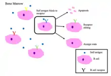 Незрілі В-клітини в кістковому мозку піддаються негативному відбору, коли вони зв'язуються з власними пептидами.[2]