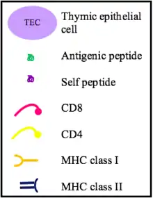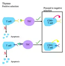 - Під час позитивної селекції Т-клітини перевіряються на їх здатність споріднено зв'язувати комплекси пептид-MHC. Якщо Т-клітина не може зв'язати комплекс MHC класу I або MHC класу II, вона не отримує сигнали на виживання, тому гине через апоптоз. Для виживання відбираються Т-клітинни рецептори яких мають достатню спорідненість до комплексів пептид-МНС.