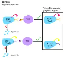 - Під час негативного відбору Т-клітини перевіряються на їх спорідненість до власних пептидів організму. Якщо вони зв'язують власний пептид, то їм надходить сигнал запуску апоптозу (процес клональної делеції).