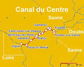 Сполучає річку Сона (біля міста Шалон-сюр-Сон) з найбільшою річкою Франції — Луарою (біля міста Дігуен). Довжина каналу становить 112,1 км[2] (за іншими даними — 127 км[3]), на каналі споруджено 61 шлюз.[2].