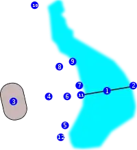 | План-схема парку Щербакова: 1 - міст через Перший міський ставок, 2 - вхід в парк з боку вулиці Університетської і пілони моста, 3 - стадіон «Шахтар», 4 - сцена, 5 - розарій, 6 - центральний фонтан, 7 - дискотека «Вечірні ритми» 8; - атракціони; 9 - човнова станція, 10 - колишній кінотеатр «Зелений», 11 - «Добрий ангел Миру», 2 - вхід в парк з боку вулиці Стадіонної. | ||||