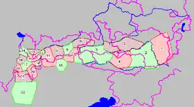 Масиви Центральних Східних Альп. Червоним кольором показані межі федеральних земель Австрії та державні кордони