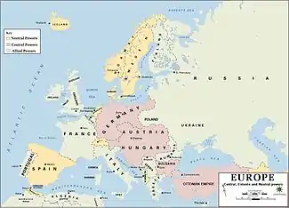 Після спалаху Європейської війни в серпні 1914 р. Османська Імперія приєдналася до союзу почавши в кінці жовтня військові дії проти Росії. Це спровокувало проголошення війни Антантою — Росією, Францією і Великою Британією. Болгарія, намагаючись змінити ситуацію після поразки в липні 1913 в війні проти Сербії, Греції, Румунії та Османської Імперії була останньою країною, що вступила в війну проти Антанти, окупуючи Сербію разом із Німеччиною і Австро-Угорщиною в жовтні 1915 року.