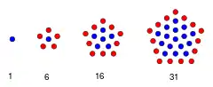 Центроване п'ятикутне число з n п'ятикутними шарами обчислюється за формулою[1] [2]