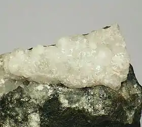 Містить (%): CaO — 46,82; SiO2 — 37,67; F — 7,99; H2O — 7,52.