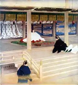 В Японії передача трону здійснювалася у випадку смерті попереднього правителя або його зречення на користь спадкоємця. У 7 — 8 століттях ця церемонія виступала синонімом інтронізації. Під час церемонії міністр Накатомі співав молитву до божеств Небес, а священик Інбе вручав новому монарху священні дзеркало і меч[4].