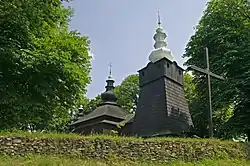 Дерев'яна церква належить до лемківського зодчества XVII століття. Архітектурна структура храму розділена на три квадрати: вівтар, нава і бабинець. Усі зовнішні елементи церкви покрити ґонтом. Над притвором височіє вежа. Кожна баня увінчана декоративними хрестами.