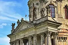 Головний фасад будівлі прикрашений портиком з 14 колон коринфського ордера. Також тут були встановлені 8 скульптур святих роботи Себастьяна Фесінгера і Йосипа Лебласа.