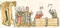 Символічне закладення церкви Богородиці Пирогощі на Подільському торжищі. За літописом — храм був кам'яний. Дерев'яний храм, зображений у мініатюрі, очевидно, існував до кам'яної споруди. Мініатюра з Радзивіллівського літопису.