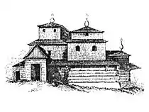 Іконографія дозволяє скласти певне уявлення про храм. Він був тридільним двоверхим, орієнтованим на осі південь-північ із входом з півдня. Складався з прямокутної нави, такої ж ширини квадратного бабинця з присінком та дещо вужчої прямокутної вівтарної частини. Нава і бабинець були увінчані четвериками із архаїчними низькими наметовими дахами; верх над бабинцем виконував функцію дзвіниці. Дах над вівтарною частиною — двосхилий. Уся будівля по периметру була оточена піддашшям. Інвентарний опис другої половини XIX ст. подає перелік окремих будівель на церковній території: дерев'яний будинок («монастир») із чотирма кімнатами; кухня (або пекарня) з житловою кімнатою; стайня; ще одна будівля, що поєднувала комору, возівню і стайню; хлів; стодола. Усі дерев'яні, криті гонтом або соломою і переважно у поганому стані.