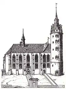Коли наприкінці XV століття князь Веттін Фрідріх III Мудрий, курфюрст Саксонії з 1486 року, відбудував колишню асканійську фортецю, архітектор Конрад Пфлюгер[5] (c. 1450—1506 / 07) та зведена між 1490 та 1511 рр.[8] у стилі пізньої готики .[3] Освячений 17 січня 1503 року, він увійшов до складу виборчого замку Фредеріка або Резенденшлосса, який також називають de .[6] Сприятливе становище Тільмана Ріменшнайдера, Якопо де Барбарі та Альбрехта Дюрера сприяла побудові замкового комплексу, а потім і церкви.