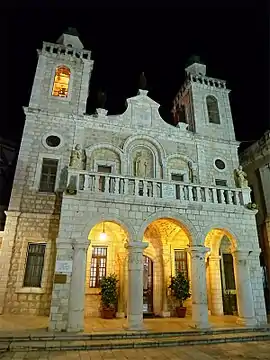 Церква прикрашена фасадом у неороманському стилі, який відноситься до типу середньовічних будівель Європи. Фасад побудований з білого каменю. Він має два поверхи і поширюється на передню частину балкона першого поверху який підтримує чотири колони. Біля входу церкви дві різні античні колони, які можуть бути з синагоги четвертого століття. На висоті першого поверху є три арки. В центральній встановлена скульптура Ісуса Христа. Фронтон з трьома скульптурами — в середині Діви Марії і на сторонах ангелів. Фасад має дві бічні вежі, чиї купола увінчані хрестами.