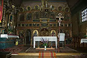 Усередині є іконостас XVII століття, розписаний синіми, червоними і золотими кольорами. Колони прикрашені ажурними мотивами з виноградного листя. Ікони розписав художник Ян Медицький, який перебував під сильним впливом бароко. Є кілька зображень, створених анонімним народним художником. У церкві також є бічні вівтарі святого Миколая, Богородиці та Христа. Ікона в останньому датується 1664 роком і спочатку була розташована у старому іконостасі того ж храму.