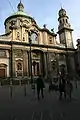 Головний фасад церкви увібрав найкращі здобутки, напрацьовані в створені храмів. Створено три входи, як то було ще в храмах доби готики (бароко запозичило конструктивні властивості готичних храмів, але перевело їх в нову стилістичну систему і нове пропорціонування). Центральний вхід виділений більшою висотою дверного отвору і розташований в ніші, парадний характер ніші підкреслений двома коринфськими колонами. Ніша облямована пілястрами і архітектурно-скульптурними декором. І колони ніші, і пілястри фасаду використані у великому масштабі — на всю висоту церкви до широкого карниза. Над ним фігурний фронтон з великим вікном для освітлення. Вертикальні осі фасаду, що проходять крізь пілястри,закінчуються скульптурами на парапеті. Чітко проглядає і купол над середхрестям. Дві дзвіниці логічно обмежують видовжений фасад і відіграють помітку роль в пишному, урочистому фасаді церкви та в архітектурному акценті вулиці та однойменної площі.