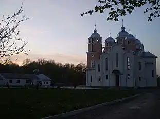 Церква Успіння Пресвятої Богородиці при вечірньому освітленні. Зліва — тимчасове приміщення.