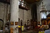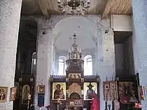 Навпроти стовпів симетрично розташовані пілястри, які служать для зміцнення склепіння та декоративних цілей[61]. У товщі стіни апсиди розміщені вузькі сходи, які вели на дерев'яні бічні галереї, об'єднані з хорами (не збереглися). Самі хори розташовувалися в західній частині над входом. До нашого часу збереглися уступи, на які спиралися хори. В товщині стін розташовувалися сходи-проходи для підйому на хори, одні з них збереглися в уцілілій північній стіні[6]. По всій довжині стін, продовжуючи хори, йшли вузькі дерев'яні балкони[62]. Також в товщі стіни є кілька отворів для зберігання цінностей[61], зараз вони закладені й отиньковані та відомі тільки за малюнками 19-го століття. Початкові склепінчасті перекриття давно втрачені, а існуюча дерев'яна стеля ніби тисне на погано освітлений простір через відсутність головного джерела світла — восьмивіконного барабана центрального купола[63].