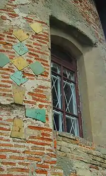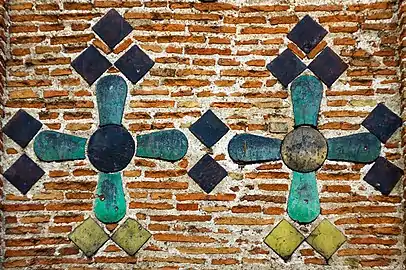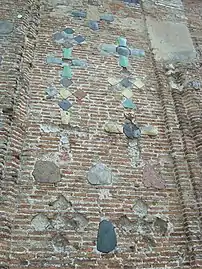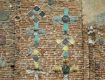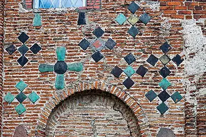 Великі кольорові камені та фігурні керамічні плитки утворювали несхожі один на одного геометричні фігури і хрести. Це створювало враження, що для оздоби використані не прості матеріали, а дорогоцінні камені[11]. На головному фасаді знаходиться вхідний арочний отвір.
