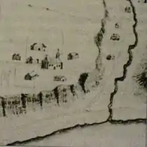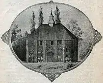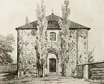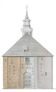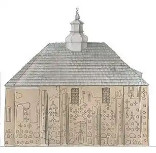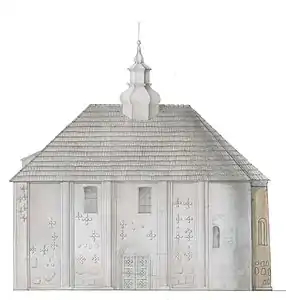 На малюнку Мартина Ольшинського, який датований до 1853 року, відображений західний фасад церкви. Замість даху з трьома куполами, що згадується в «Інвентарі» І. Кульчинського, видно вже звичайний чотирисхилий дах, увінчаний скромним металевим хрестиком. Кутова пілястра, до якої примикає паркан з колод, трохи розширена і позбавлена майолікової прикраси. Майже над самою огорожею в пілястри видно невелике віконце, по якому проходить тріщина. Воно освітлювало сходи, вбудовані в західну стіну, — по них потрапляли безпосередньо на хори. Велике вікно посередині фасаду та отинькована закладка отвору явно пізніші. Через них також проходить тріщина, що говорить про наближення катастрофи.