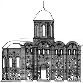 До наших днів збереглися північна і частина західної стіни, три апсиди і два західні підкупольні стовпи. Церква має розміри: довжина — близько 21,5 м, ширина — близько 13,5, товщина стін — 1,2 м[2]. Стіни складені з плінфи в техніці рівношарової кладки. Фасади прикрашені лопатками ступінчастого профілю, вставками з гнейсових, базальтових і гранітних каменів різних відтінків зі шліфованою зовнішньою поверхнею, різнокольоровими глазурованими керамічними плитками. У верхній частині стін розташовані вузькі віконні прорізи з арковими перемичками[4]. Родзинкою інтер'єру є безліч керамічних глечиків-голосників, вмурованих у верхні частини стін і склепіння[5]. У цегляну кладку стін фасадів включені різнокольорові шліфовані камені, які утворюють різні геометричні фігури і хрести. Все це надає фасадам краси, створює враження інкрустації стін дорогоцінним камінням[6].