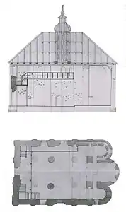 Церкву умовно можна поділити на дві частини: основну та об'єм трьохапсидної вівтарної частини. У свою чергу основний об'єм, бічна стіна якого розділена лопатками на чотири прясла, складається з двох частин. У крайньому західному пряслі між західною стіною і першою парою стовпів знаходиться нартекс і розміщені над ним хори. Трьом іншим пряслам фасаду відповідає простір наоса, де колись був купол на барабані[59].