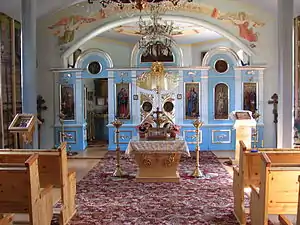 Перший іконостас був привезений сюди із розібраної дерев'яної церкви з Холмщини і встановлений в 30-ті роки XX століття. У 1947 році, під час виселення лемків, цей іконостас був втрачений. З того часу збереглися тільки царські врата. У храмі встановлено лавки.
