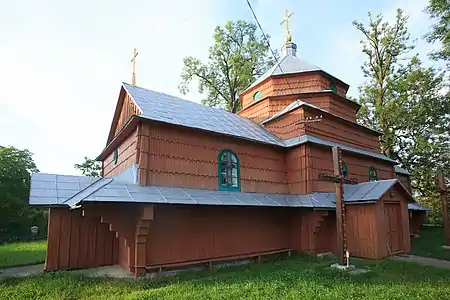 Церква тризрубна одноверха. Об'єм нави накритий восьмигранним шатром, який завершений глухим ліхтарем з маківкою. Бабинець і вівтар мають двосхилі дахи. По периметру будівлі влаштоване піддашшя. Входи з півдня та заходу підкреслені двосхилими дашками, які виступають з площини піддашшя.