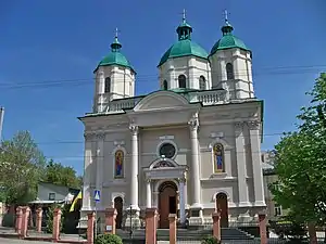 Орієнтацію костелу визначила вулиця Шевченка, до якої звернено його фасад. Головний об'єм зального типу тринавний трипрясловий з широкою центральною навою, двопрясловим пресбітерієм з тригранною апсидою, втопленою у будівлі монастиря. Вікна апсиди виходять у внутрішній двір монастиря. У будівлі монастиря розташоване захристя. Над ним розміщена каплиця з виходом на балкон пресбітерія. Фасад розчленовано на два яруси антаблементом, фриз якого декоровано голівками путто у квадратних вставках і ліпними рослинними композиціями по площинах поміж ними. Нижній ярус по краях обрамлено парами пілястр композитного ордеру. По центру перед двома пілястрами встановлено дві канельовані колони композитного ордеру, на які опирається портик з напівкруглим фронтоном. Внизу площини фасаду розміщено високий цоколь, перед яким виступають п'єдестали пілястр, колон. У бічних площинах понад цоколь виступають вузькі дверні прорізи бічних нав з півциркульним завершенням. У верхній частині понад профільованими тягами у нішах були встановлені фігури святого Франциска Ассізького і Антонія Падуанського, у яких зараз встановлено фрески Матері Божої та Ісуса Христа. Центральний високий вхід обрамлено едикулою, що є зменшеним варіантом обрамлення центральної площини. Над нею розміщено кругле вікно. Поверх антаблементу йде аттик у вигляді глухої балюстради. Раніше над ним розміщувався високий фронтон понад центральною площиною нижнього ярусу. Він був фланкований парами пілястр і завершений напівкруглим фронтоном. У центральному полі в ніші була встановлена композиція Свята Родина. При відновленні 1990-х років фронтон не відбудовували. Було встановлено три куполи на високих восьмигранних барабанах, декорованих по гранях пілястрами і розчленованих проміжними карнизами на 4 яруси. У високому 3 ярусі розміщено по 4 вікна. Бічні фасади були розчленовані по вертикалі парами пілястр, по горизонталі цоколем, профільованою тягою.