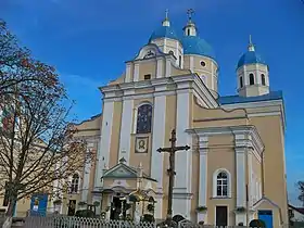 Будівля церкви цегляна, у плані має вигляд рівнораменного хреста, західну кінцівку якого утворює тринавний об'єм. Центральна нава, завершена главою, значно вище бічних нефів і трансепта. Головний фасад, оздоблений у стилі бароко, прикрашений пілястрами, установленими на високих цоколях, увінчаний карнизом і фронтоном криволінійних обрисів. До центрального входу в XIX в. був прибудований невеликий притвор із трикутним фронтоном. Південний фасад костелу позбавлений архітектурного декору. З півночі та сходу до будівлі храму примикають двоповерхові монастирські келії з просторим прямокутним внутрішнім подвір'ям.