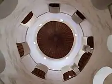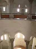 Церква являє собою дві концентричні циліндричні стінні конструкції навколо центрального кругового простору. Найширший циліндр створює зовнішню овальну стінну поверхню церкви, до якої зі східної сторони прибудовані три напівкруглі апсиди по усій її триповерховій висоті. Зовнішня стіна декорована дрібними пілястрами, а зі своєї внутрішньої сторони — напівкруглими нішами. Між пілястрами розміщені вікна. Периферійна стіна поділена на перший і другий поверхи. На висоті другого поверху периферійна стінна конструкція з'єднана з центральним циліндром, створюючи таким чином на другому поверсі галерею центрального простору. Центральний круговий простір єдине по усій висоті споруди і закривається вужчою циліндричною стінною конструкцією, закінчується центральним тамбуром з крівлею у вигляді дрібного конуса. На першому поверсі ця конструкція спирається на шість великих пілонів, взаємопов'язаних арками, і на дві монолітні колони, які трьома арками відкриваються у напрямку до апсид. Такий розпорядок елементів повторюється і на другому поверсі, з тією різницею, що отвори там набагато нижчі. До галереї ведуть гвинтові сходи, які закінчуються у її вестибюля. Головні ведуть прямо до вівтаря, бокові розташовані по лівому і правому її боку.
