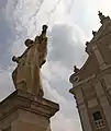 Головний фасад тричастинний, центральна частина ширша за бічні. На рівні другого ярусу центральна частина поєднана з бічними могутніми волютами, а її верхня частина увінчана трикутним фронтоном з чотирма декоративними вазами та скульптурою[2].