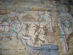 На північній стіні нави зберігся настінний живопис із зображеннями Розп'яття і Страшного суду. Між вівтарем і навою установлений іконостас 1794 року. У ризниці барокового вівтаря найпомітнішою іконою є Розп'яття. Окрім того, у невеликому вівтарі 1706 року збереглась ікона «Ecce Homo».