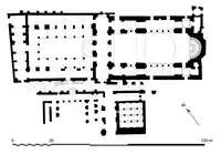 Вибудувана з червоної цегли і каменю. Належить до типу купольних базилік, з якими храм поєднують три нави. Бічні нави невисокі, відокремлені від центральної низкою колон. Над колонадою — галереї другого поверху. Центральна нава надзвичайно широка. Масивні пілони підтримують велетенські арки, другий ярус яких нічим не відокремлений від внутрішнього простору храму, що збільшує враження просторості. (Гадають, що аркади 2-го ярусу колись були, але їх розібрали, від чого зальність церкви виграла). Перехід до бані здійснено сферичними вітрилами, добре відомими по споруді так званого мавзолею Галли Плацидії в Равенні. Баня широкого куполу невисока, з низкою напівциркульних вікон, але головує в зовнішньому вигляді храму. Церква мала і другу баню на захід від головної(відновлена нині в прямокутному вигляді з низьким дахом. Вікна західної бані нині закладені цеглою.)